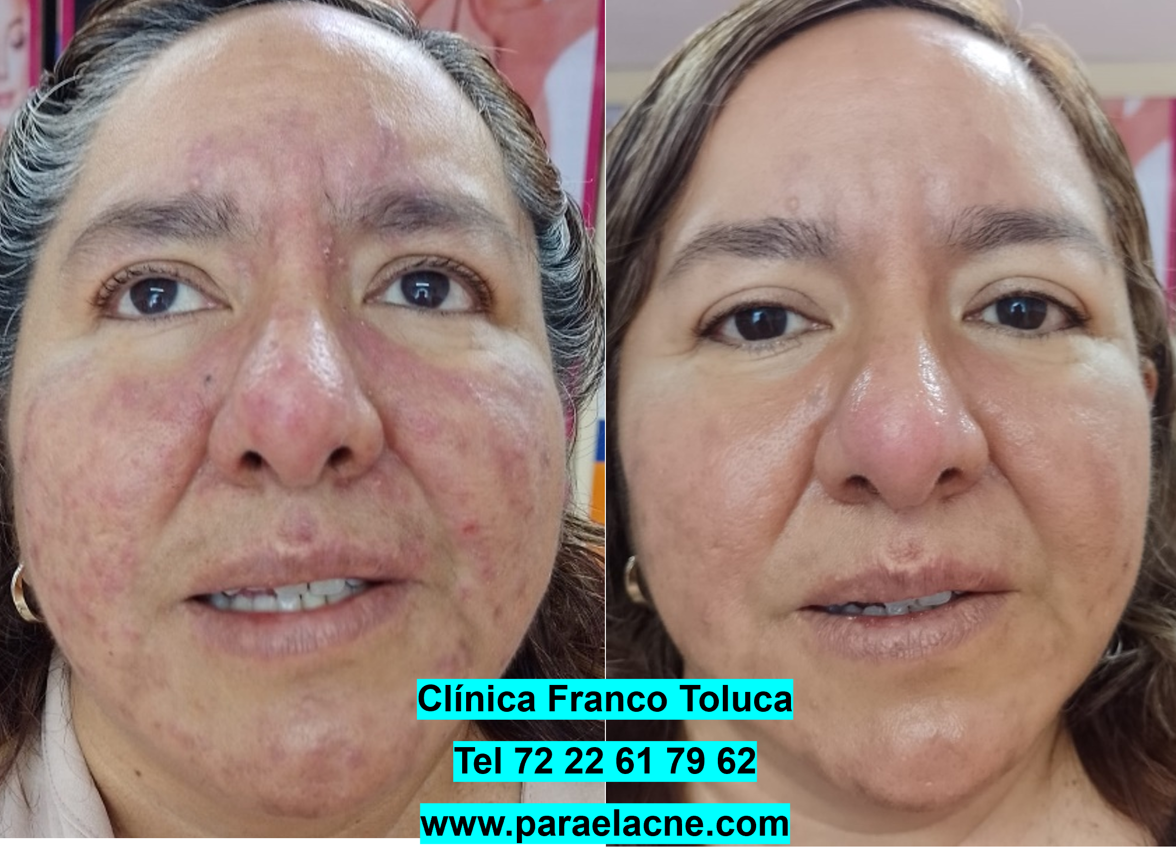 ACNE PUSTULOSO; presenta enrojecimiento, puntos negros que se transforman en el clásico BARRO, lleno de pus, dolor e inflamación, puede ser en una parte de la cara o en toda incluso también pecho, espalda y piel cabelluda, tiene tratamiento médico, evite usar remedios caseros, la consecuencia de utilizar consejos de personas no expertas es la cicatríz y la mancha permanente de la piel, ACUDA CON EL QUE SABE.